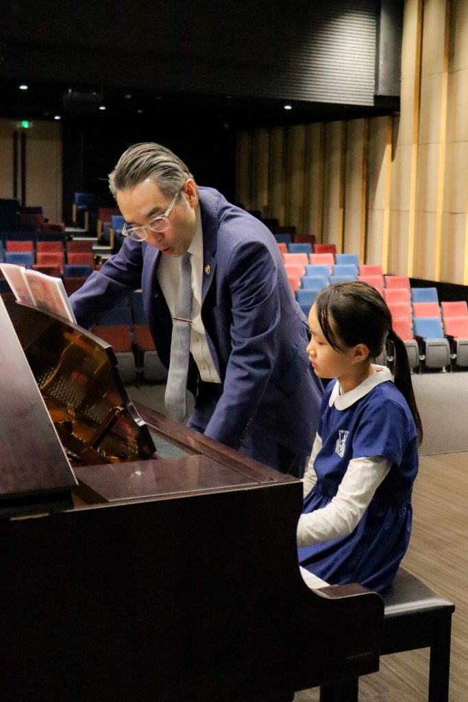 在课堂上,无论是低年级孩子的稚嫩弹奏,还是高年级学生的技巧展示,Mr Warren Lee都全神贯注。他时而俯身示范,指尖流淌出动人旋律;时而侧耳倾听,捕捉每一个音符的细微之处;时而轻声点拨,启发学生找到自己的表达方式。
